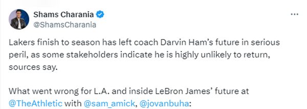 据Shams报道,湖人主帅哈姆下赛季极不可能回归。