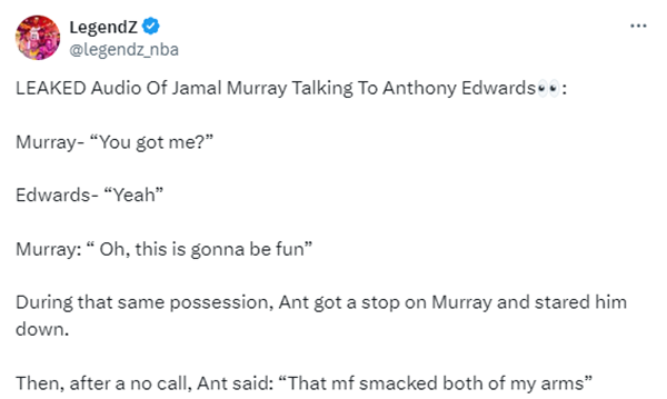 目前森林狼大比分1-0领先掘金,根据赛程,两队G2将在明天上午10点开打,值得一提的是,爱德华兹因盯着雷吉而吃到的技术犯规已经被联盟撤销了。