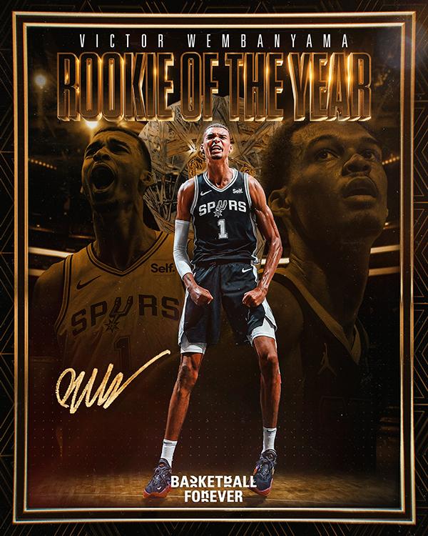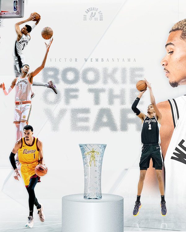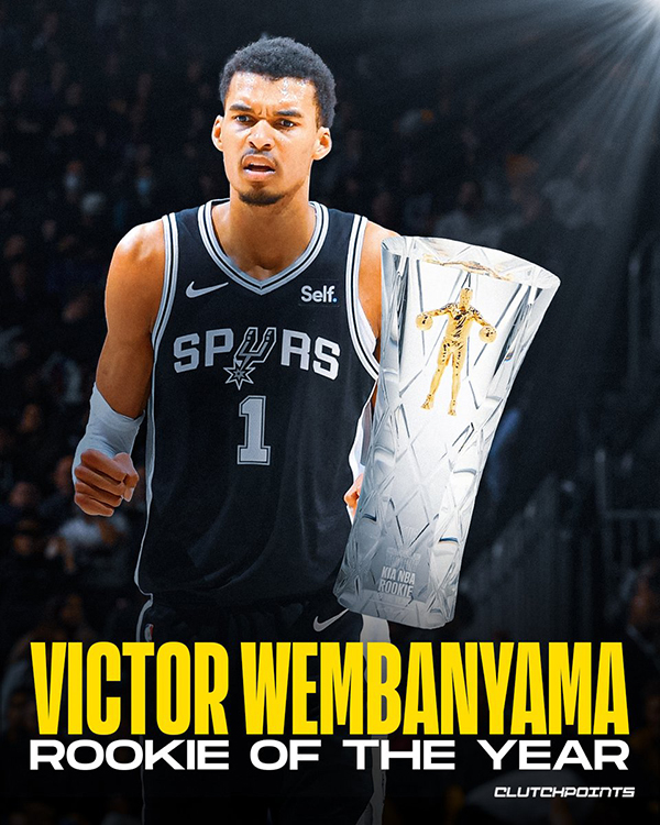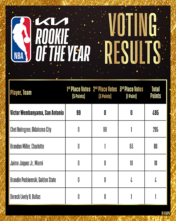 在年度最佳新秀的投票结果中,文班亚马(获全部99张第一选票,总共495分)力压切特-霍姆格伦(雷霆榜眼)和布兰登-米勒(黄蜂榜眼),荣获NBA最佳新秀年度大奖。