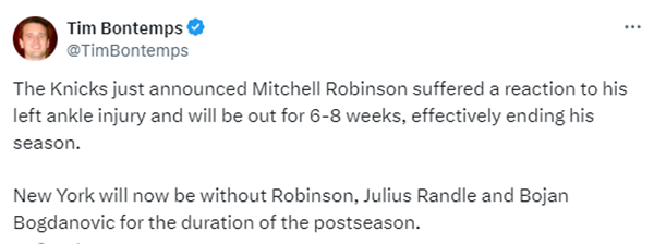来源:直播车05-08 10:28直播车讯 北京时间5月8日,纽约尼克斯官方宣布,米切尔-罗宾逊遭遇左脚踝应力性损伤,他将在6-8周后接受复查,如果按6周来算,米切罗复出时间则是6月19号,这意味着米罗因伤提前赛季报销。