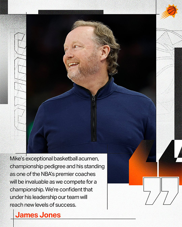 太阳篮球运营总裁兼总经理詹姆斯-琼斯表示:迈克非凡的篮球敏锐度、冠军血统以及他作为NBA顶级教练之一的地位,在我们争夺冠军的过程中将是无价之宝。我们相信,在他的领导下,我们的团队将在成功上达到新的高度。