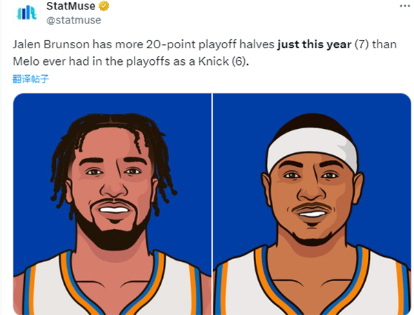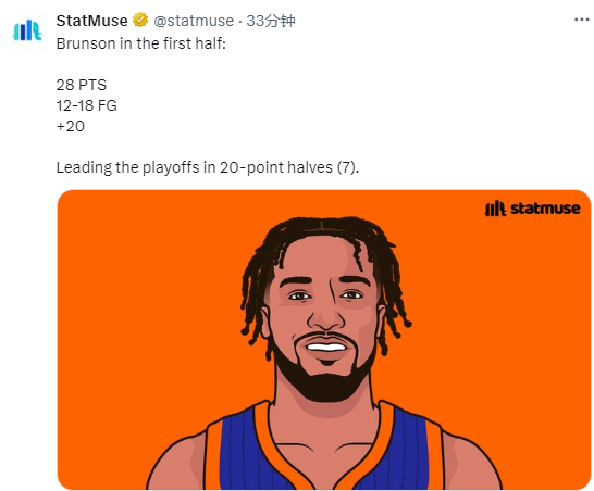 5、布伦森今年季后赛7次半场20+,超越甜瓜尼克斯生涯季后赛半场20+次数