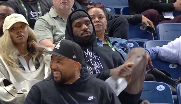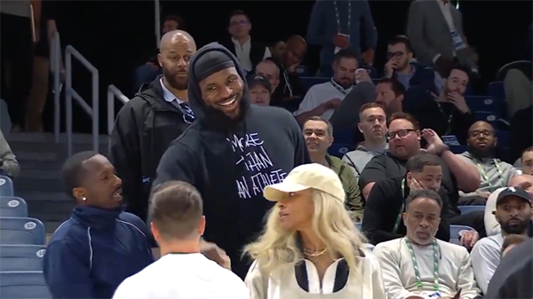 詹姆斯身穿黑色连帽卫衣和黑色短裤,与爱妻萨瓦娜一起走进球场,入场后詹姆斯夫妇与里奇-保罗等友人击掌以及拥抱,老詹还和里奇-保罗寒暄了几句,之后詹姆斯落座并且翘起二郎腿观看比赛。