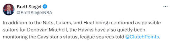 据报道,今夏联盟将会打响米切尔争夺战,名记Brian Windhorst报道,若米切尔决定离开骑士,湖人、火箭、篮网和热火都是其潜在下家,湖人和篮网都已经准备好了向骑士报价米切尔;另一记者Brett Siegel则表示老鹰也在悄悄关注米切尔的状态。