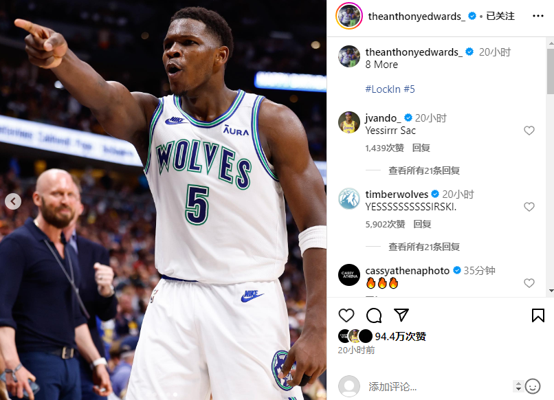 森林狼4-3淘汰卫冕冠军掘金从而杀进西决,华子带队时隔20年重返西决,这也是森林狼队史第2次晋级分区决赛;在球员通道中,华子高呼:我给穆雷戴上了手铐。