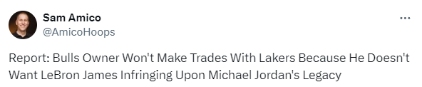 曝公牛因怕詹姆斯挑战乔丹地位而拒绝与湖人交易