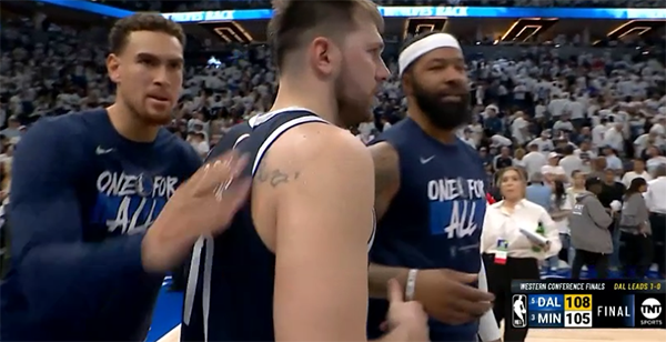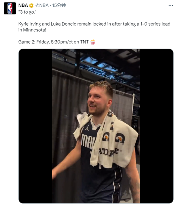 森林狼众将第一时间扭头离场,背影中写满了沮丧和遗憾;独行侠获胜后东契奇握拳以及拥抱队友,欧文则是咧嘴大笑,与众队友击掌庆祝;在返回更衣室途中,欧文心情大好并且与众人一起庆祝,东契奇满脸笑容,表示:还差三场胜利。