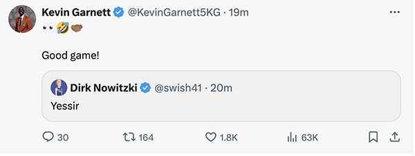 独行侠名宿诺维斯基发推庆祝,森林狼名宿加内特回复:眼睛+笑哭握手表情,精彩的比赛。