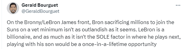 太阳另一记者Gerald Bourguet表示:在詹姆斯和布朗尼方面,勒布朗牺牲数百万美元以底线加盟太阳队并不像看起来那么离谱,勒布朗是亿万富翁,虽然这不是他接下来去哪里打球的唯一因素,但与儿子一起打球将是一生难得机会。