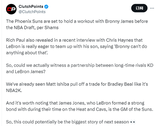 美媒Clutch Points晒詹杜、布克、比尔和布朗尼联手的P照,配文写道:太阳将试训布朗尼,最近里奇-保罗透露詹姆斯非常渴望与他的儿子联手,我们真的能见证詹姆斯和杜兰特合作吗?我们已经看到了太阳老板促成比尔的惊天大交易,值得一提的是,在效力骑士和热火期间,詹姆斯和太阳总经理詹姆斯-琼斯建立了深厚的友谊,因此詹杜联手可能是今夏最大的新闻。