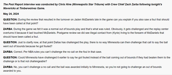 其实,在这场比赛结束后,森林狼跟队记者Chris Hine第一时间就采访了主裁扎克-扎巴,裁判也给出了相应的解释。
