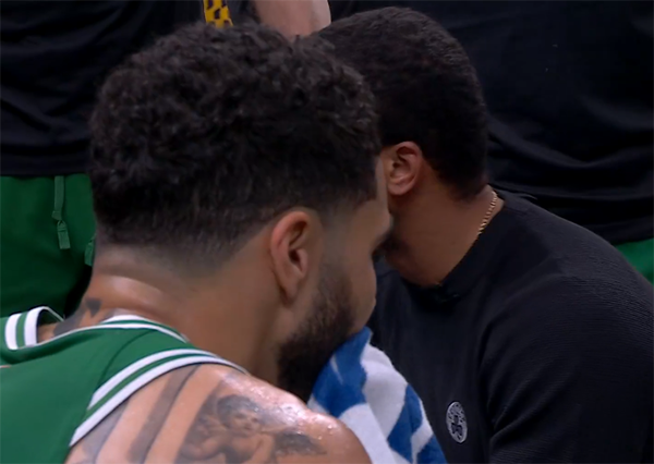 下半场,在落后两位数的情况下,69-84落后15分后绿军双探花继续带队反扑,布朗冲击篮筐,塔图姆干拔三分、防守大帽西亚卡姆以及抢断特纳,绿军打出10-2反击高潮追到7分,期间塔图姆累得弯腰扶膝直喘粗气,三节打完绿军落后9分。