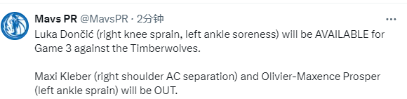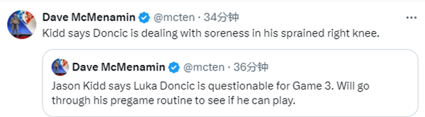 值得一提的是,基德透露东契奇正在处理右膝扭伤的酸痛问题,G3出战成疑,他将在热身后决定是否出战,之后球队官宣,东契奇(右膝扭伤和左脚踝酸痛)可以出战;今年季后赛至今,东契奇几乎一直带伤出战,总比分2-0领先有望夺赛点,而且现场有些球迷飞跃5000多英里来到现场,就是为了看东契奇打球。