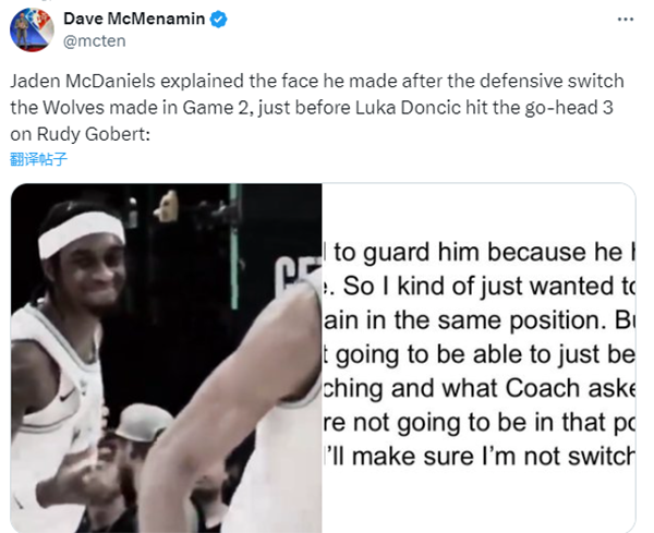 西决G2东契奇单挑戈贝尔命中准绝杀三分,当时麦丹的表情似乎暗示他那时就知道球队要输了,对于自己最后时刻的表情,今日麦丹回应表示:我只是想要防守他,因为上场比赛他在我面前同样的位置投进了一个球。所以我就是想再防他一次。但我知道我不能这么做,因为我们在执行换防,而且这是教练要求的。所以,希望我们不会再处于那种情况,如果真的发生了,我会确保自己不再换防。