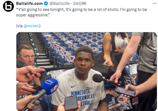 西决G3赛前,谈到自己的侵略性不足,爱德华兹表示:今晚我会投很多投篮的,我这轮系列赛出手次数还没有单场超过16次过,我需要加强我的侵略性。不管谁在我面前防守我,我都要去到自己想去的位置然后出手投篮,你们今晚瞧好吧。