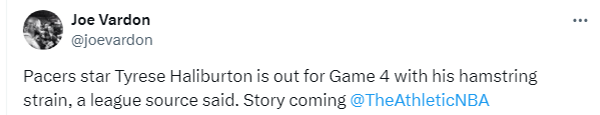 来源:直播车05-28 08:49直播车讯 北京时间5月28日,东决G4开打之前,名记woj报道哈利伯顿大概率缺席,之后据NBA记者Joe Vardon报道,步行者球星泰瑞斯-哈利伯顿因腿筋拉伤将缺席东决第四场比赛。