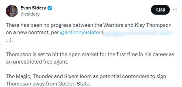 勇士希望以合适的合同留下汤普森,但预计汤普森将在7月份进入自由球员市场;美记Evan Sidery表示,若汤普森离开勇士,魔术、雷霆和76人是他的潜在下家,汤普森仍希望追求总冠军。