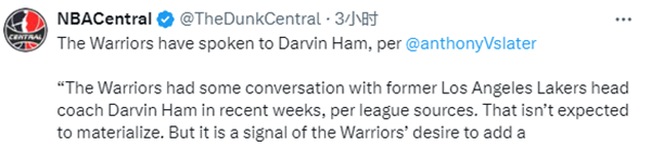 联盟多位消息人士表示,勇士正在考虑增加教练组成员,无论骑士是否聘请阿特金森出任主教练;最近几周,勇士和湖人前主帅达尔文-哈姆(5月初被湖人解雇)进行了些许对话;虽然哈姆加入勇士教练组不太可能成真,但这是勇士增加大牌助教的信号,有迹象表明他们正在寻找一些前主帅或前球员来填补这个角色。