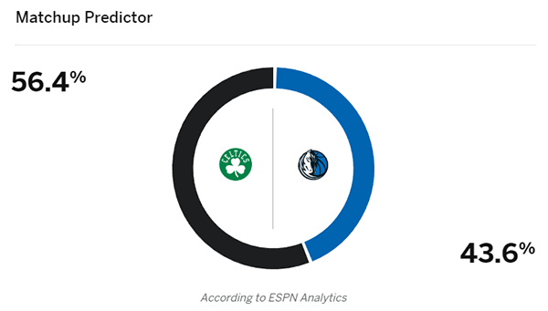ESPN已经公布总决赛G3胜率——凯尔特人56.4%,独行侠43.6%;即使客场作战,ESPN仍旧看好绿军拿下第三场。