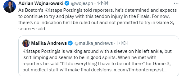 名记woj报道,正如波士顿的克里斯塔普斯-波尔津吉斯告诉记者的那样,他决心并希望在肌腱受伤的情况下继续在总决赛中打球,目前还没有迹象表明他会被排除在第三场比赛之外。