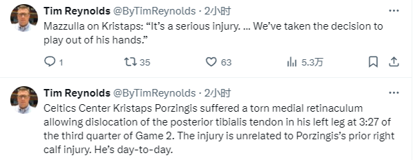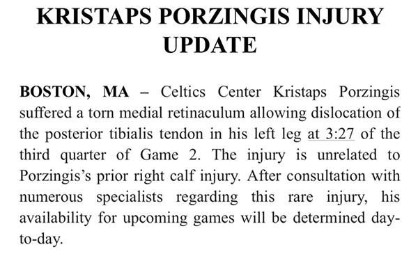 名记shams报道,凯尔特人队的波尔津吉斯内侧支持带撕裂,导致左退胫骨后肌腱脱臼,因伤被列为每日观察,这与他之前的小腿拉伤无关;凯尔特人官方已经公布这一伤病。