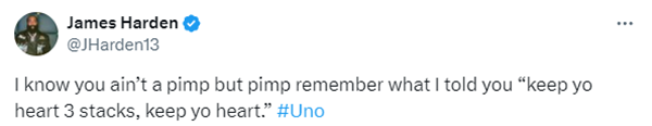 哈登晒出自己身穿西装、打着领结的帅照,戴着墨镜、名表和各种大金链子,配上一段说唱歌词,写道:我知道你不是个花花公子,但花花公子,记住我对你说过的话:‘保持初心,3 stacks,保持初心。