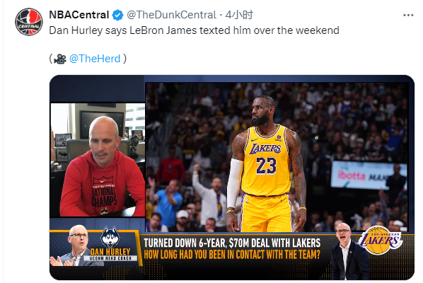 来源:直播车06-14 20:28直播车讯 湖人猛烈追求NCAA名帅丹-赫尔利并且报价6年7000万美元,最终赫尔利拒绝湖人合同,决定留守康大冲击三连冠;今日赫尔利透露詹姆斯曾发短信招募他,一番话暗示给的合同太小;美媒报道赫尔利的老婆对湖人挖人一事十分愤怒,她不想让赫尔利执教湖人。