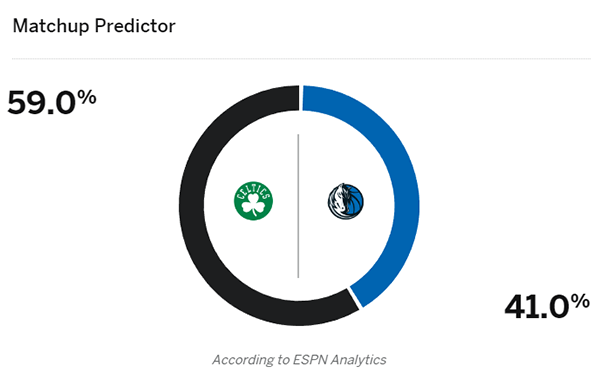 ESPN预测G4胜率——凯尔特人59%,独行侠41%,换言之,ESPN看好凯尔特人4-0夺冠;总决赛前三场比赛,凯尔特人打出统治力,G3开场落后13分仍统治下半场并且稳稳拿下胜利,不得不说,两队实力差距悬殊;绿军已经把一只脚迈上了总冠军颁奖仪式的舞台上。