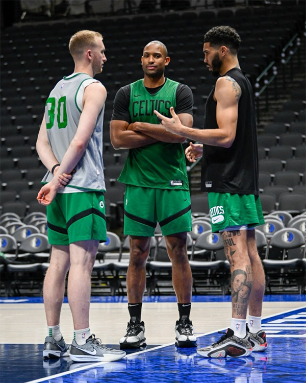从绿军官方晒出的训练照可以看出,杰伦-布朗身穿黑色卫衣,面带笑容十分轻松;塔图姆与霍福德一起交流,绿军主帅马祖拉抱着篮球与怀特开心畅聊,霍乐迪搂着怀特和普里查德,波尔津吉斯参加了一些训练;训练后全队围在一起并且喊口号,目标自然是明天夺冠。