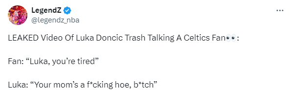 据美媒报道,在总决赛G5比赛期间,凯尔特人的场边球迷说:卢卡,你真的累了;东契奇直接爆粗口回击:你妈是TM婊子;球迷惊呼并表示:为什么骂妈妈,我没有说啥脏话。