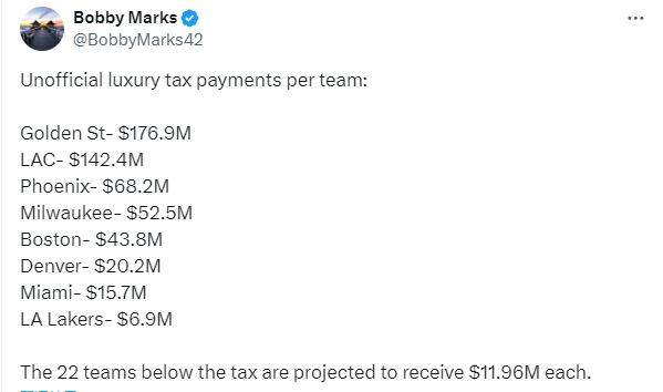 今日NBA薪资专家Bobby Marks分析了本赛季各支球队的奢侈税情况(各队奢侈税非官方版本)——1、勇士1.769亿美元;2、快船1.424亿美元;3、太阳6820万美元;4、雄鹿5250万美元;5、凯尔特人4380万美元;6、掘金2020万美元;7、热火1570万美元;8、湖人690万美元;剩余22支奢侈税线下的球队,每支球队能够分得1196万美元。