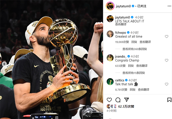 来源:直播车06-20 11:43直播车讯 北京时间6月20日,凯尔特人球星杰森-塔图姆更新社交媒体,晒照庆祝夺得总冠军引热议,詹姆斯领衔众星点赞,布朗狂赞历史最佳。