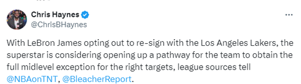由于受到联盟38岁规则的限制,詹姆斯最高可以与湖人续签3年1.62亿美元,并且有资格获得交易否决权;不过詹姆斯正考虑降薪续约,名记Chris Haynes报道,詹姆斯选择跳出合同并重新与湖人续约,这位超级巨星正在考虑为球队打开一条道路,用于球队招募合适目标提供全额中产特例。