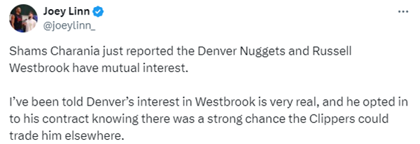 快船正在寻求交易威少,名记shams报道,掘金和威少相互有兴趣,掘金对威少的兴趣非常浓厚,威少执行球员选项是因为他知道自己很可能被交易到其他球队。