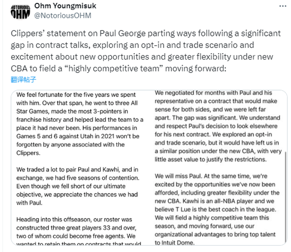 快船声明——乔治已经通知我们,他将与另一支球队签约。乔治是一名极具天赋的精英攻防双向球星,在过去的五年里,他三进全明星,打破队史三分纪录,把球队带进了历史新高度。他在2021年季后赛对阵爵士G5、G6的表现不会被忘记。