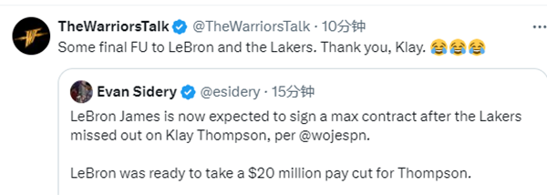 来源:直播车07-02 15:25直播车讯 北京时间7月2日,NBA达成一笔重磅大交易,克莱-汤普森通过先签后换的交易方式离开勇士,与独行侠签下3年5000万美元合同,新赛季他将联手东契奇和欧文冲冠。