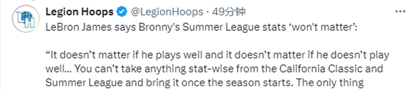 来源:直播车07-07 15:54直播车讯 NBA夏季联赛加州经典赛,湖人94-108不敌国王,布朗尼全场出战21分钟,9投2中、三分3中0、罚球2中0拿到4分2篮板2助攻1抢断;赛后布朗尼透露自己有些紧张并相信自己能够克服;詹姆斯回应表示夏联打得好坏无所谓,相信儿子会越来越好的。