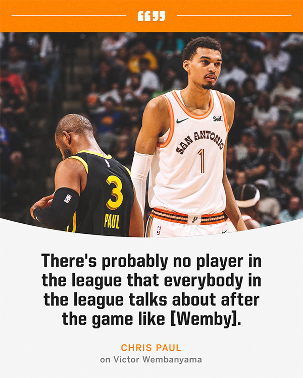 保罗以马刺球员的身份亮相时表示,波波维奇一直是他非常钦佩的竞争对手,很高兴能在其麾下打球和学习。谈到文班亚马,保罗直言有与文班亚马一起打球的机会促使他选择加入马刺,还称和哈里森-巴恩斯在飞机上交流时都认为,在职业生涯的这个阶段,能有机会日复一日欣赏文班亚马是很酷的事。