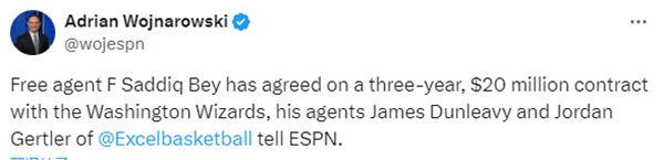 今夏萨迪克-贝与老鹰的合同到期并且没有获得资质报价,从而成为一名自由球员,如今25岁的萨迪克-贝与奇才签下3年2000万美元,新赛季他将为奇才效力,对于重建的奇才来说,贝是一名不错的建队成员。