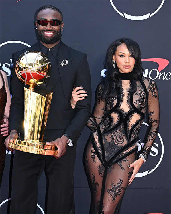 今日杰伦-布朗抱着总冠军奖杯,戴着墨镜、盛装出席ESPY年度颁奖典礼,在走红毯环节,布朗与小波特前女友凯斯雷-冈德雷齐克亲密合影——冈德雷齐克身穿性感的蕾丝透视装,挎着布朗的手臂,像极了一对小情侣。