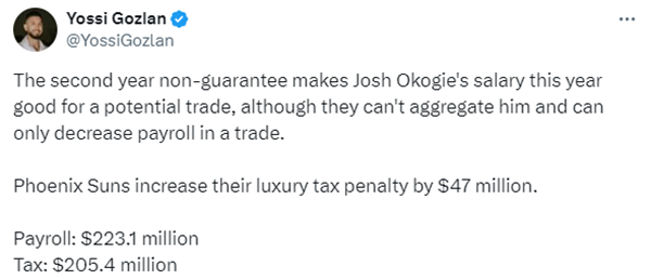 据薪资专家报道,太阳续约奥科吉将球队的奢侈税罚款提高了4700万美元,球队总薪水高达2.231亿美元,税款为2.054亿美元,总开支高达4.285亿美元。