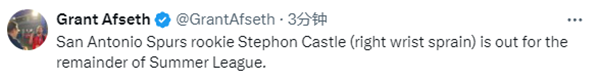 意外!卡斯尔右手腕扭伤,夏联提前报销