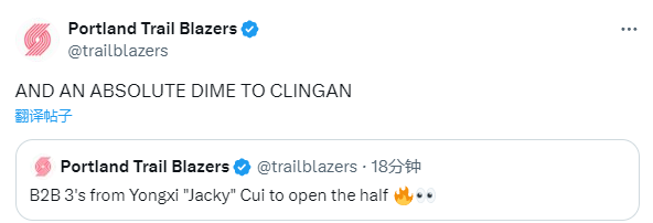 开拓者官方连续发推盛赞崔永熙,先是发推写道:崔永熙第二节一开始连续两记三分;又写道:然后一个绝妙的助攻,给到克林根!在发推晒集锦并直言:“疯狂的影响力!