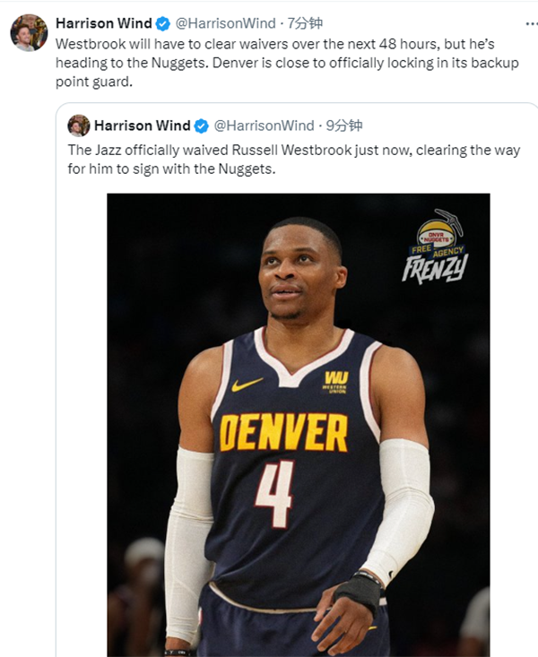 据此前报道,威少将在澄清期后以自由球员的身份加盟掘金,据悉约基奇希望掘金引援威少,小乔丹也扮演了十分重要的角色;新赛季威少将改穿掘金战袍开启生涯新篇章,辅佐约基奇和穆雷冲击总冠军。