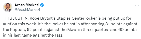 科比的斯台普斯中心更衣柜将于7月31日在苏富比拍卖行出售,估价约为150万美元。