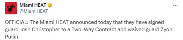 与热火签下双向合同后,克里斯托弗表示:我非常高兴能正式成为热火文化的一部分,这是我的荣幸。我总是能够在压力和挑战下表现得非常出色,这个夏天是我迈向职业生涯下一步所需要的一切。我非常感激管理层和团队能给我这个机会,作为一名篮球运动员和我个人,我期待着更加努力充分发挥出我全部的潜力,这只是我重生的开始。