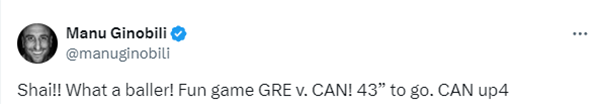 亚历山大出色的表现引热议,马刺名宿马努-吉诺比利发推盛赞:Shai真是个好球员!希腊对阵加拿大的比赛真有趣,比赛还剩43秒,加拿大领先4分。