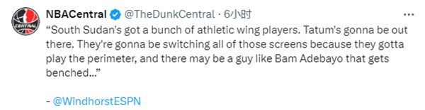 对于塔图姆将出战与南苏丹的比赛,Brian Windhorst表示:当他们周四对阵南苏丹时,南苏丹有很多运动型侧翼球员。塔特姆会在场上,美国队会一直对掩护进行换防因为他们必须防守好外线,所以像阿德巴约类型的球员可能被弃用。布克可能会被按在板凳上,因为杜兰特将进入首发阵容,这就是美国队的特点,这是一个真正的奢侈。