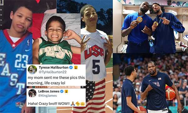 来源:直播车08-15 11:53直播车讯 北京时间8月14日,与童年偶像一起夺得奥运金牌是什么感受?步行者球星哈利伯顿更新社交媒体,晒儿时身穿詹姆斯球衣和杜兰特球衣的照片,老詹本人回应:兄弟,太疯狂了。