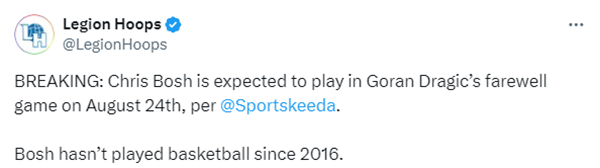 如今外媒报道,40岁的波什也将参加德拉季奇的告别赛,这将是波什自从2016年因疾病(血凝块)被迫宣布退役以来首次参加比赛,将与众星一起打比赛,球迷表示这也将是波什的告别赛。